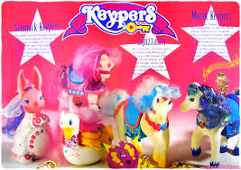 Keypers were produced by Tonka from 1985 to 1992. They were large, hard plastic bodied adults and small softer plastic bodied babies. The adult Keypers had a key (with their name on) which locked and unlocked a door somewhere about their body, and the baby Keypers had a slit in their backs where you could store things, like drugs or the souls of the fallen. Along with the plastic toys there were large plush adult Keypers, books, games etc